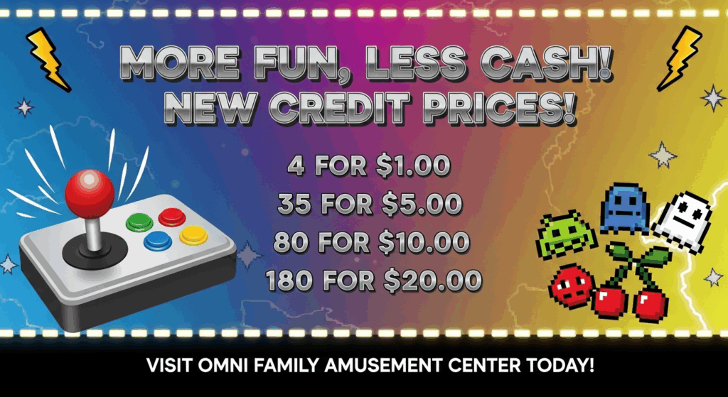 Offering over 100 new and fun games for the entire family! We have a clean delicious snack bar as well as a huge redemption counter with many fun and exciting prizes to redeem your winning tickets. We also offer movies at Omni Cinema next door, and play all the miniature Golf you can fit in at Mountasia right next door and down from that you can play Indoor at Pirate Black Light Mini Golf. It’s always a wonderful family fun filled experience at Omni Plaza!!