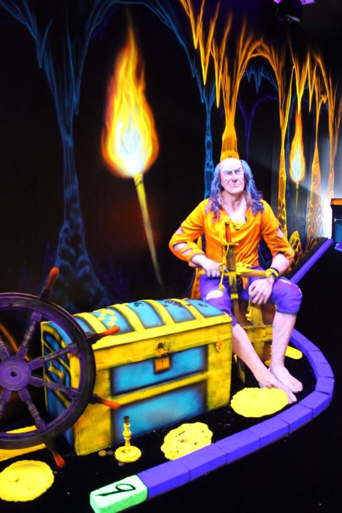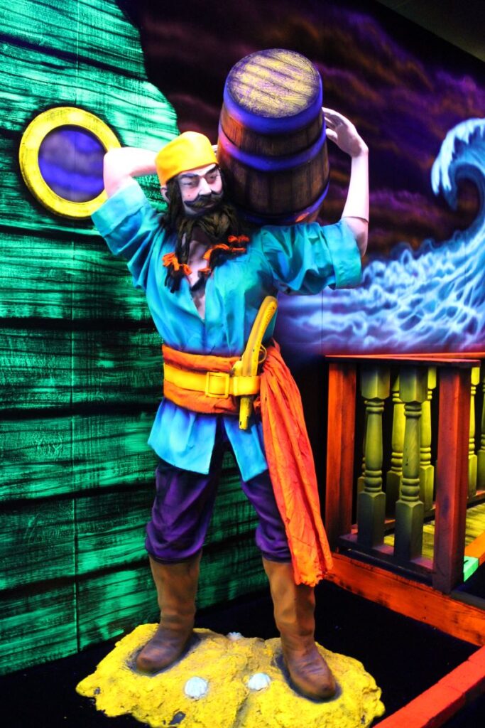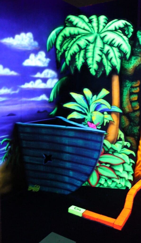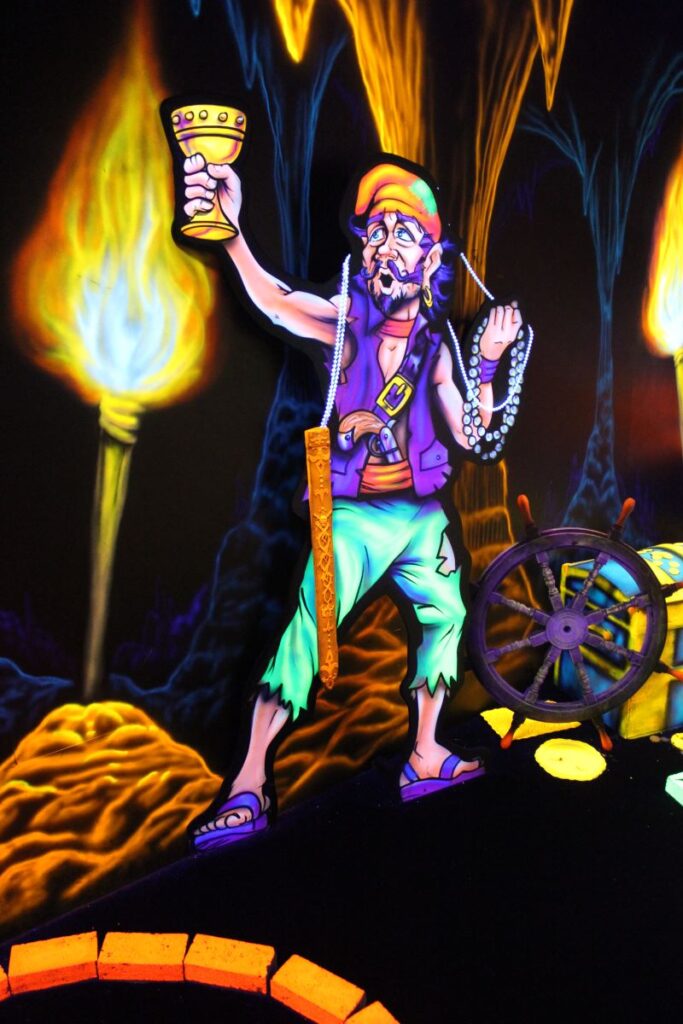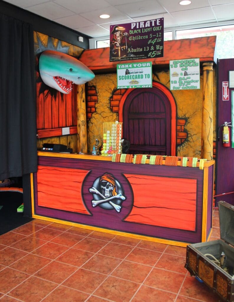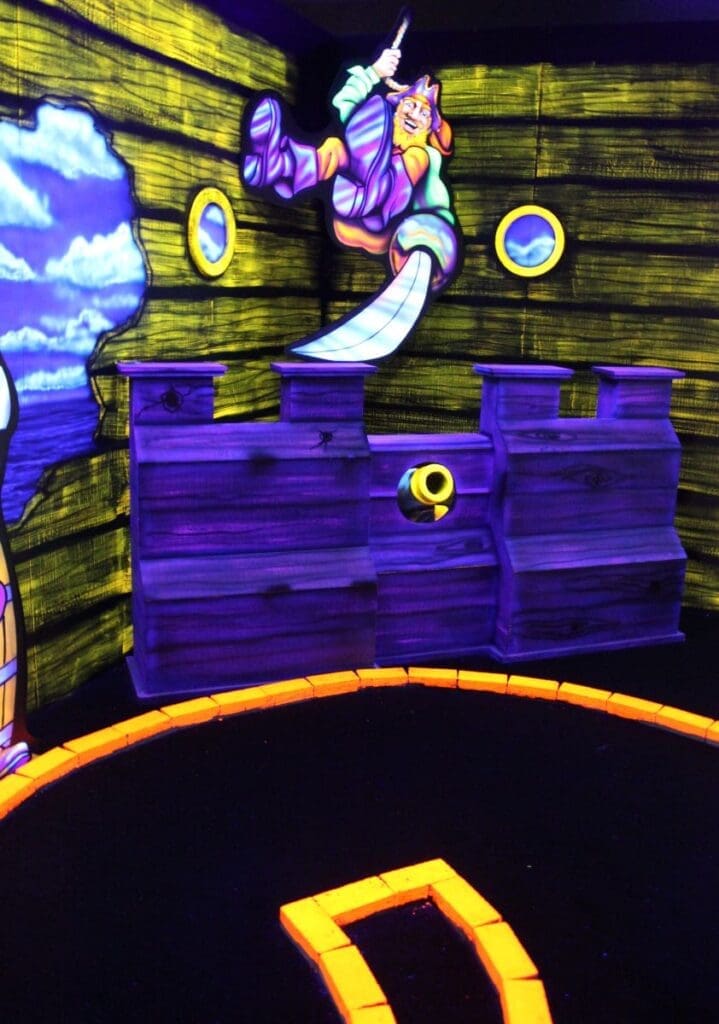 Pirate Black Light Golf is Fayetteville’s most exciting indoor miniature golf courses on the high seas! You’ll putt through pirates, parrots, cannons, and gold treasure for the most fun you can have putting indoors in Fayetteville. We are located in the Omni Family Amusement Center in the Omni Plaza Complex.