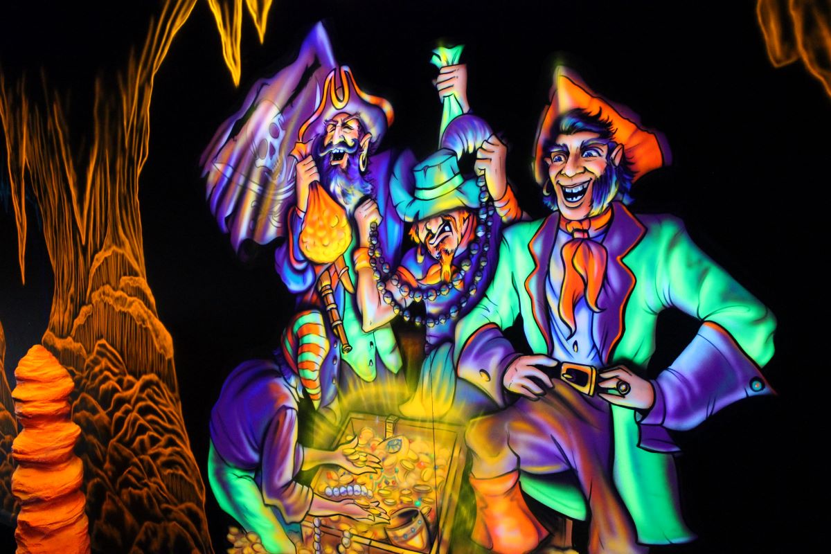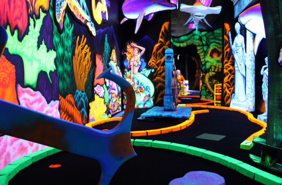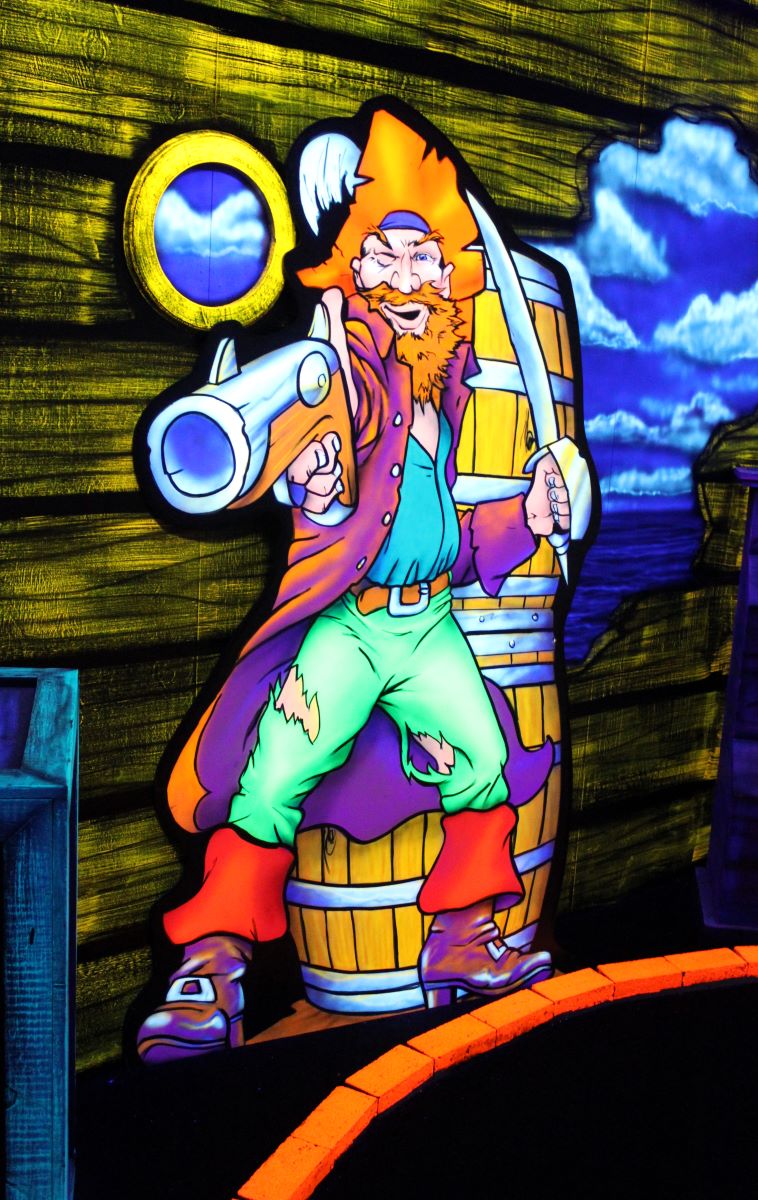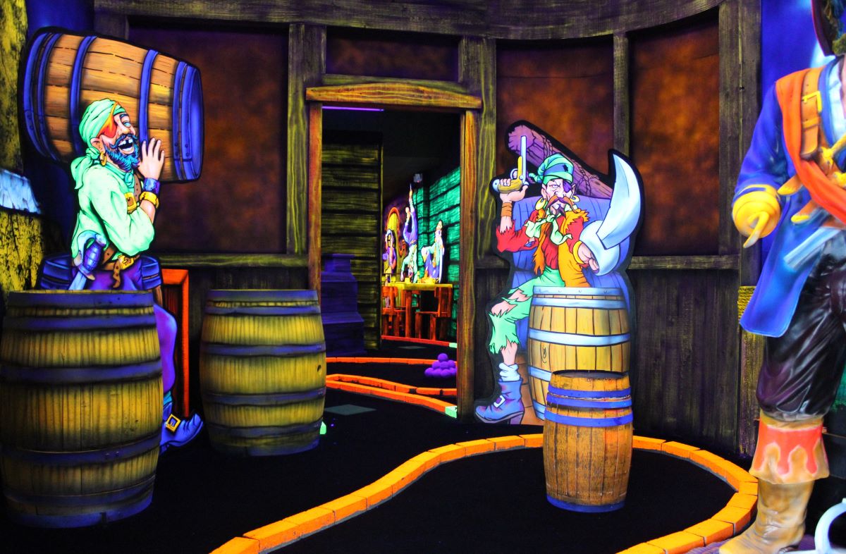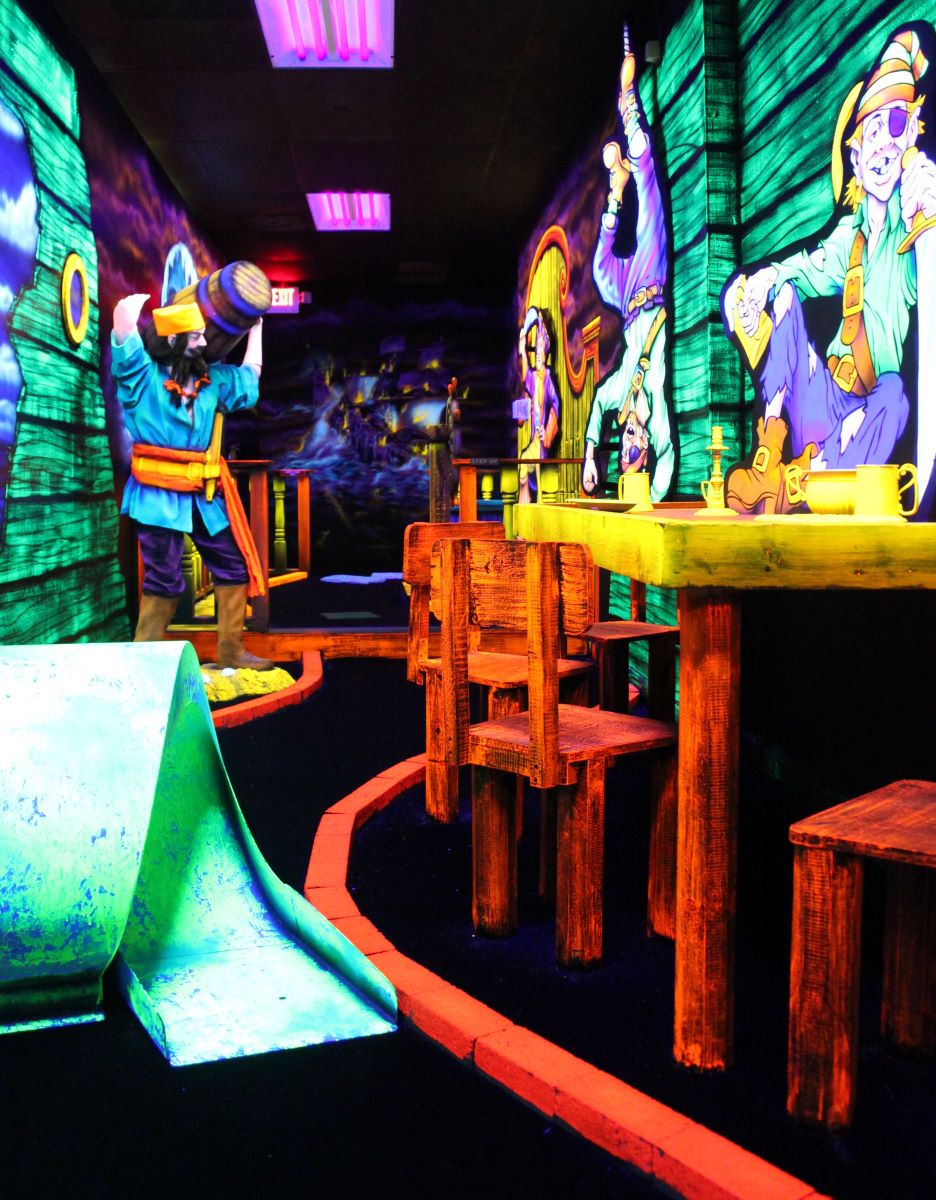 Pirate Black Light Golf is Fayetteville’s most exciting indoor miniature golf courses on the high seas! You’ll putt through pirates, parrots, cannons, and gold treasure for the most fun you can have putting indoors in Fayetteville. We are located in the Omni Family Amusement Center in the Omni Plaza Complex.